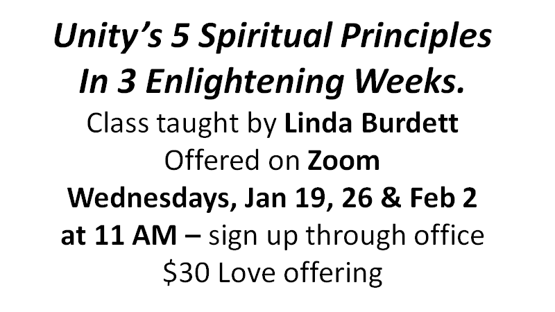 We will review the Five Spiritual Principles often discussed in Unity and take this knowledge deeper into our consciousness. Join Linda Burdett, Ministerial Intern, in this three week Zoom class. Starting Wednesday January 19th at 11:00 am until 12:30. The class is being offered for a $30.00 love offering and supplies will be provided by email. Register now at ucec@unityofelcajon.org